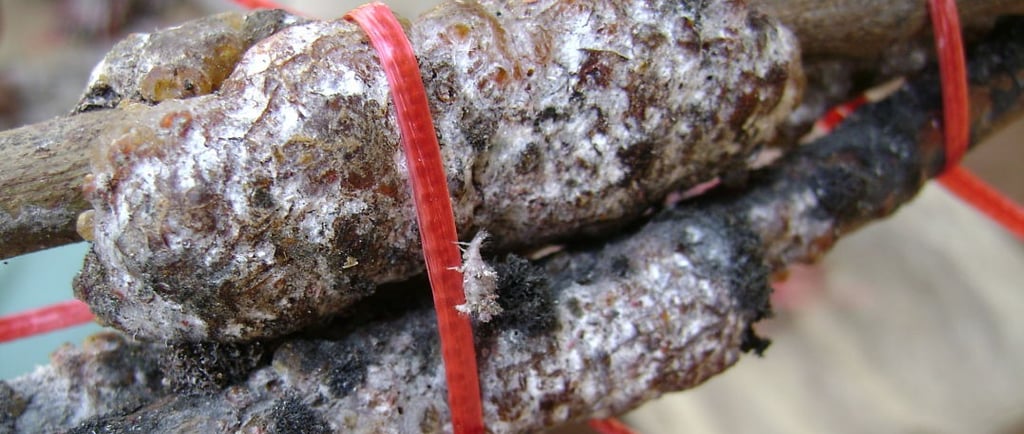 The story of shellac starts with a small scaly insect in India that is attracted to the twigs of several species of tree. The bugs suck the sap from the tree for nourishment and as part of their reproductive process excrete a resin to protect themselves and their eggs. This resin is called lac and is the raw material used to make shellac.
